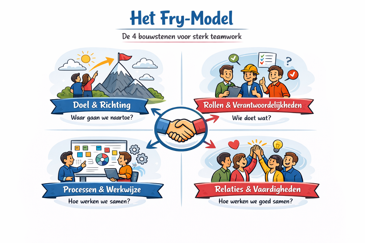 Dit sluit naadloos aan bij het model van Fry: doel, rollen, processen en relaties als fundament voor autonomie. Zonder die elementen vraag je mensen om verantwoordelijkheid te nemen, maar geef je hen niet de middelen om dat te doen.